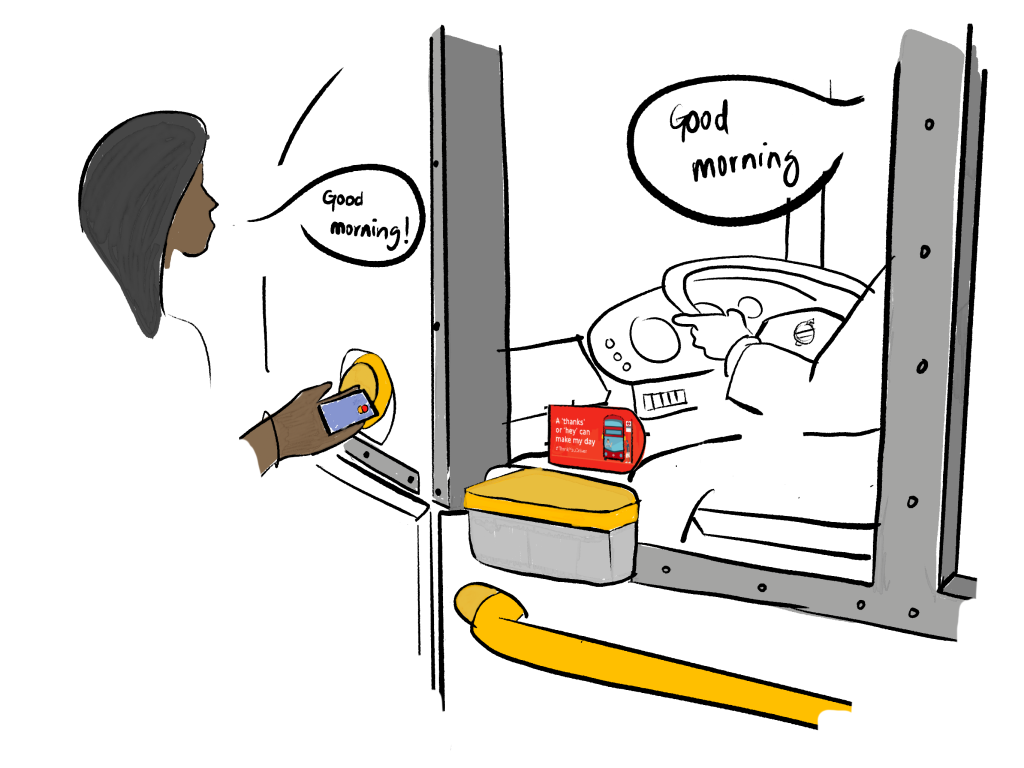 We conducted research with passengers and drivers to understand potential blockers to engagement and then worked with drivers to co-design some potential low cost, impactful interventions to encourage greater engagement from/with passengers on their bus.