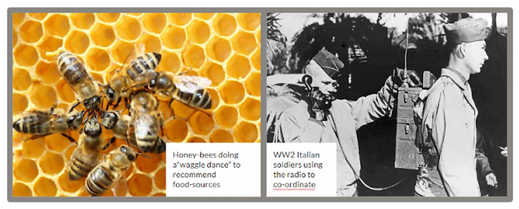 In this section we show a clever-looking “theory of change” diagram but actually the answer is “doh” simple. Think of soldiers: a platoon of soldiers out on the battlefield constantly signalling or on their radios. Think of wild-animals: monkeys using calls to warn the group of predators, or bees gesturing to show where the best flowers are.
