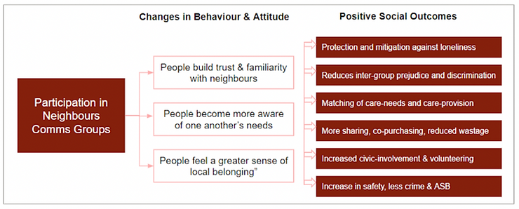 We at Neighbourly Lab believe that local neighbourhood comms groups are an essential tool for increasing social-connectedness in the UK. Neighbours that are joined up together in these groups are more likely to get to know each other, build trust in one another, participate in local events and democracy and share resources. And this basic layer of hyperlocal comms enables neighbours to create an everyday “mesh of care”, to look out for one another in times of need, and to assert their collective power to shape their place’s future prosperity.